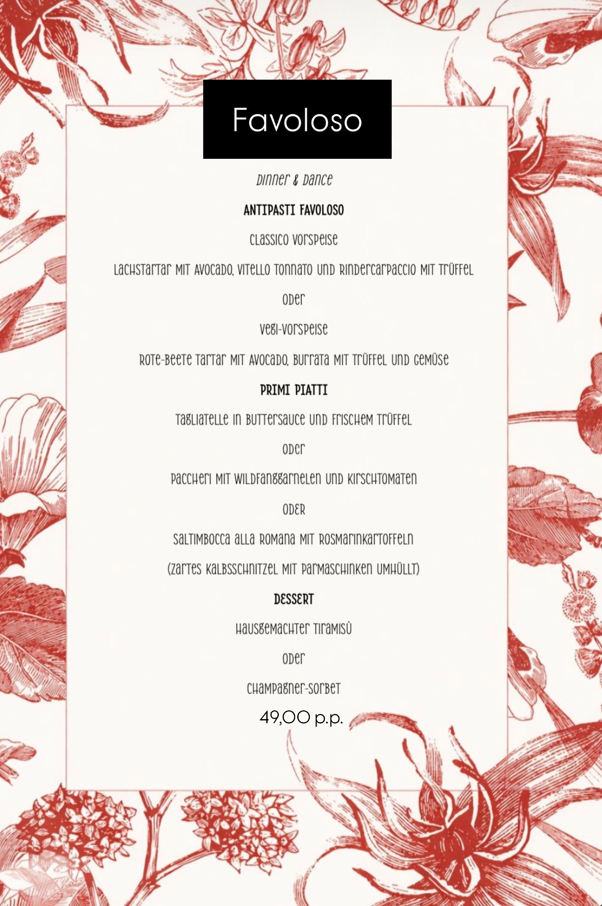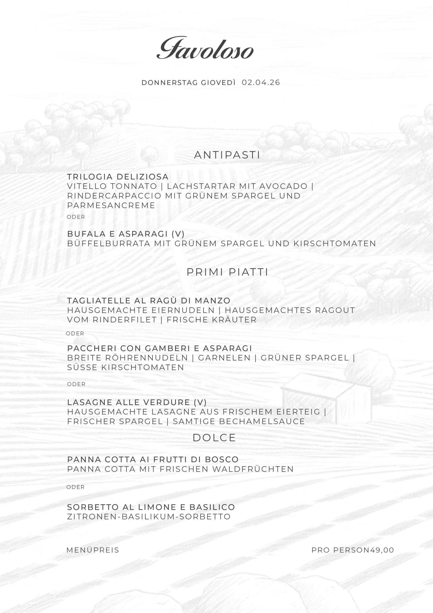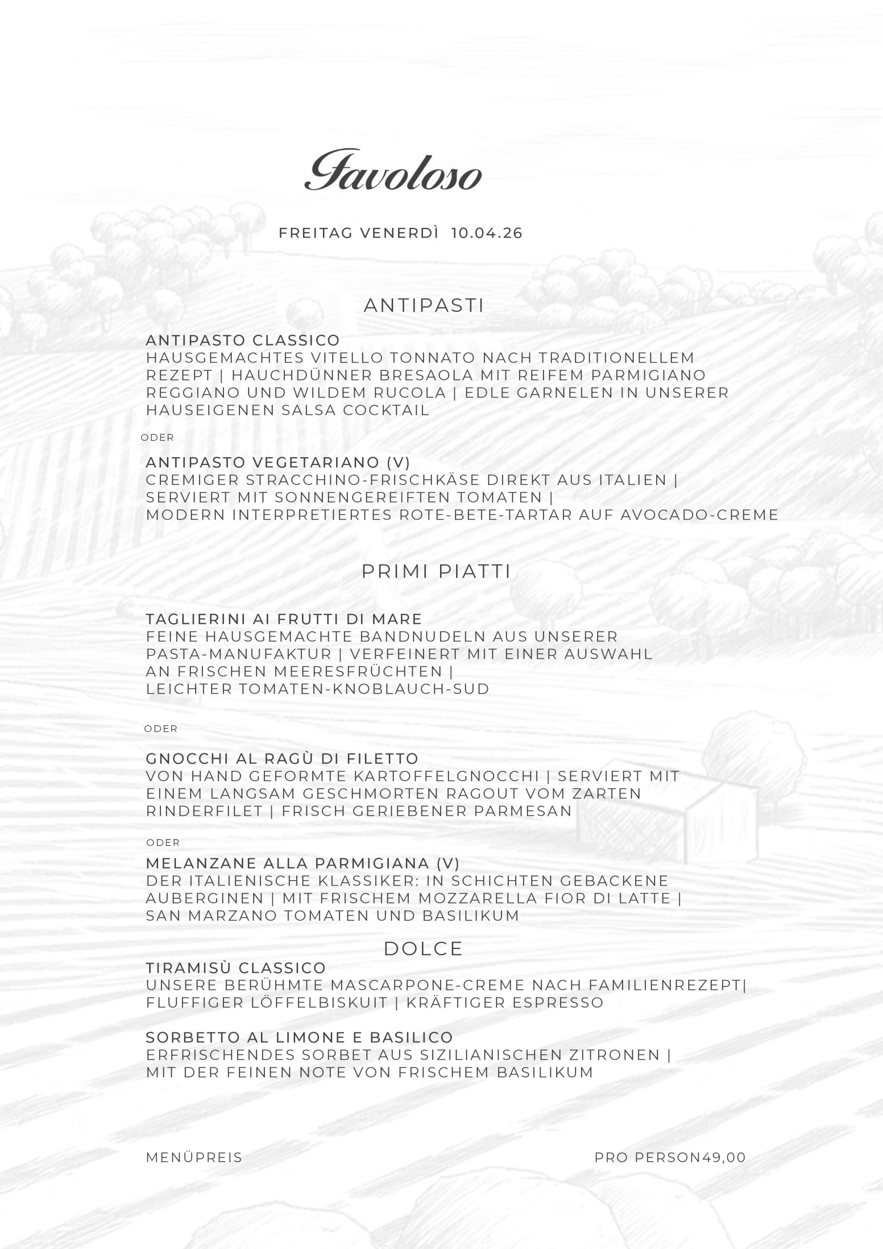 Das FAVOLOSO serviert seinen Gästen einen schnellen und exquisiten Business Lunch mit hausgemachter Pasta, frischem Fisch, Gemüsesalat oder anderen italienischen Spezialitäten.
